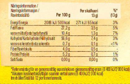 Majsmjöl, solrosolja (hög oljesyra) (27%).